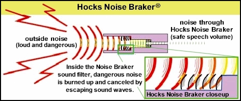 Hocks Noise Braker® Filter ear plugs use the Accelerated Resonant Decay principle to convert sonic energy into thermal energy by means of compression acceleration. (The rise in temperature is so minute you will never even notice it!) In plain English, this means Noise Brakers® bounce part of the dangerous incoming noise back out of your ear, and that piece of sound partially cancels out the incoming noise, reducing it to a safe volume level. The louder the dangerous noise, the more sound that gets automatically canceled out. As a result, no sound over approximately 85 decibels is allowed to pass through the filter into your ear!