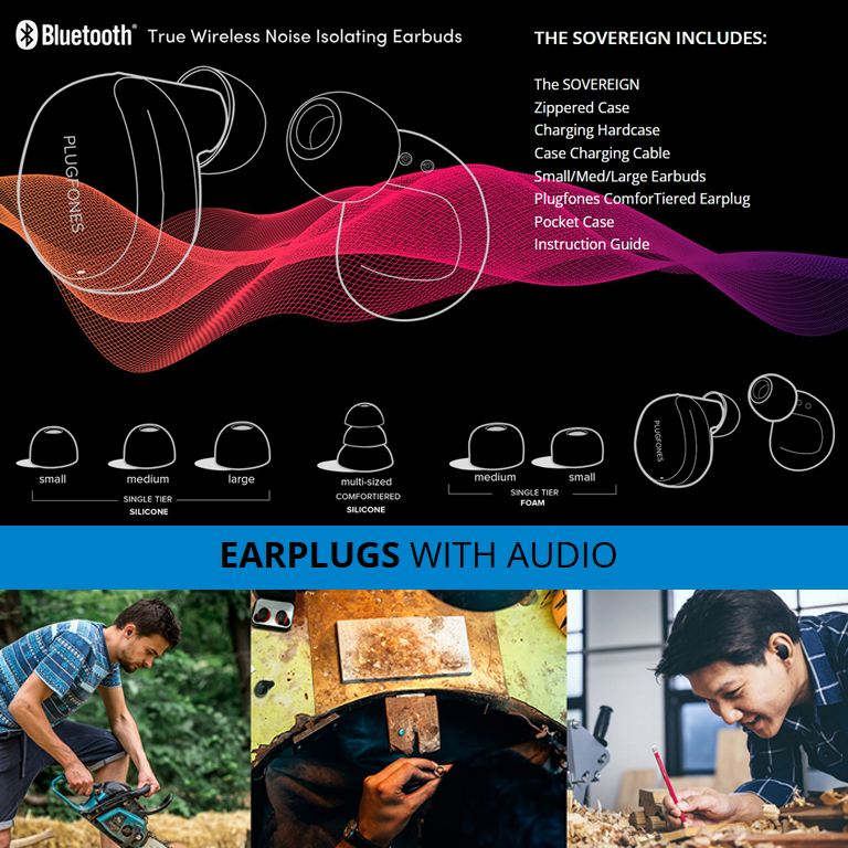 Hearing Protection Ear Plugs + Built-In Bluetooth Audio Plugfones Sovereign Earplugs with Audio deliver full sound with big, deep bass, all in a compact wireless package. These earplugs with audio use Noise Shield sensor technology to block unwanted exterior noise. This doesn't just provide protection from hazardous noise - it actually makes your music sound better. The addition of hearing protection actually enhances music listening in two ways at once: first, blocking external sound lets you achieve sound isolation, so your music sounds pure and clear without disturbances, and second, the sound you want to hear is also sealed in, so that even listening at much lower volumes can deliver a better, richer sound quality. Plugfones calls it "immersive bass," and it is exactly what it sounds like: big, pure, complete sound you could wrap in. With Sovereign, you can catch every note, every breath, every nuance - and block out the rest of the world, too. ComforTiered Plugs for Comfort + Complete Immersion Your earphones are only as good as the fit - period. If they hurt, fall out, or fail to seal in sound, you can't wear them while you work, and they definitely won't protect your ears from noise. Plugfones brings ComforTiered plug tips to the table to make sure the Sovereign fits well, with a good acoustic seal and a comfortable feel that holds up to extended wear. Three sets of tips provide you with three fit styles: a ComforTiered triple-flange silicone pair, and single tier silicone plugs in two sizes for smaller ear canals. Please note that the tips determine what level of hearing protection the Plugfones Sovereign provides: the single-tier silicone tips are rated NRR 19, while the triple-flange silicone tips and single-tier foam tips are all rated NRR 22. Quick Charge + Smart Features The Sovereign is loaded with smart features for a superior user experience. These electronic earplugs boast a mega battery system with six hours of charge life in the earbuds plus another 18 hours of life from the included charging case for a total of up to 30 hours of untethered listening. Plugfones Sovereign Bluetooth earbuds are designed for rugged use. A smart sound-focused mic and Noise Shield technology combine to ensure the Sovereign adapts to your environment and provides noise dampening exactly when you need it, including in industrial environments. Adaptive response keeps the Sovereign responding even when you're wearing gloves, and IPX rated water resistance and sweat-proofing means the Sovereign can keep up with you whether you're on the job, at home, or on an adventure. Hearing Protection You Can Count On. Plugfones say that "they're earplugs first and earbuds second," which is another way of saying these OSHA-compliant hearing protection devices are rated and ANSI-certified for use in high noise work environments where hearing protection is required. They're enormously popular among workers - as well as home DIYers, commuters, students, and others who need to seal out external noise while enjoying music and other streaming Bluetooth audio. What's In The Box
